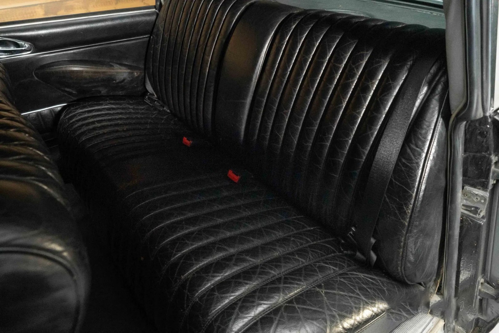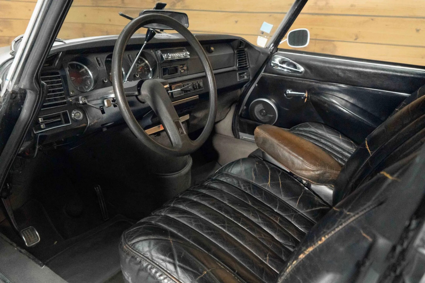 - Интерьер отделан чёрной кожей с естественной патиной, что подчёркивает подлинность и историю автомобиля.
