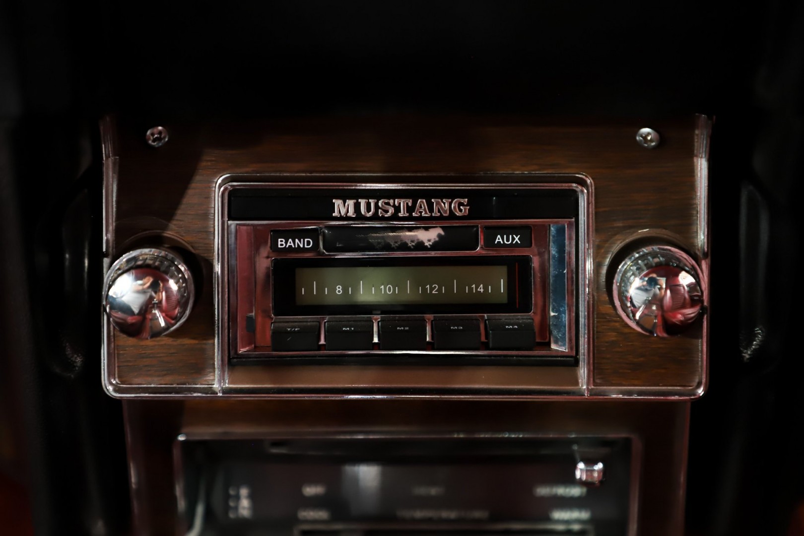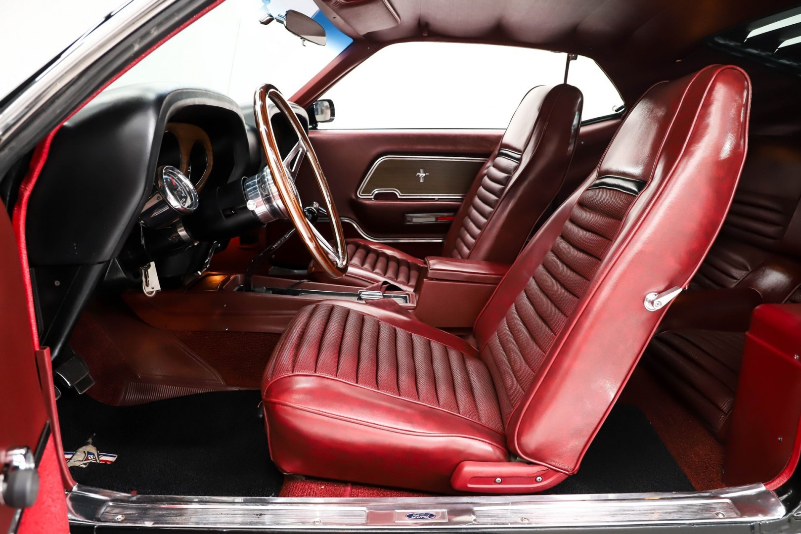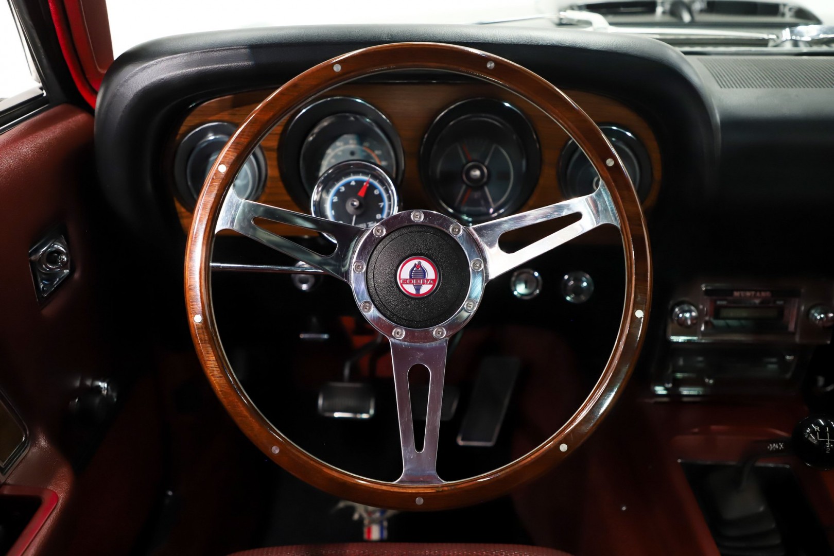 - Интерьер: Заводской «Deluxe» вариант в красном цвете — высокие ковшеобразные сиденья, формованные дверные панели, свежий ковролин и потолочная обивка. Установлены руль в стиле Shelby, колонный тахометр Sun и ретро-аудиосистема. Центральная консоль с Hurst-рычагом — приглашение к драйву.