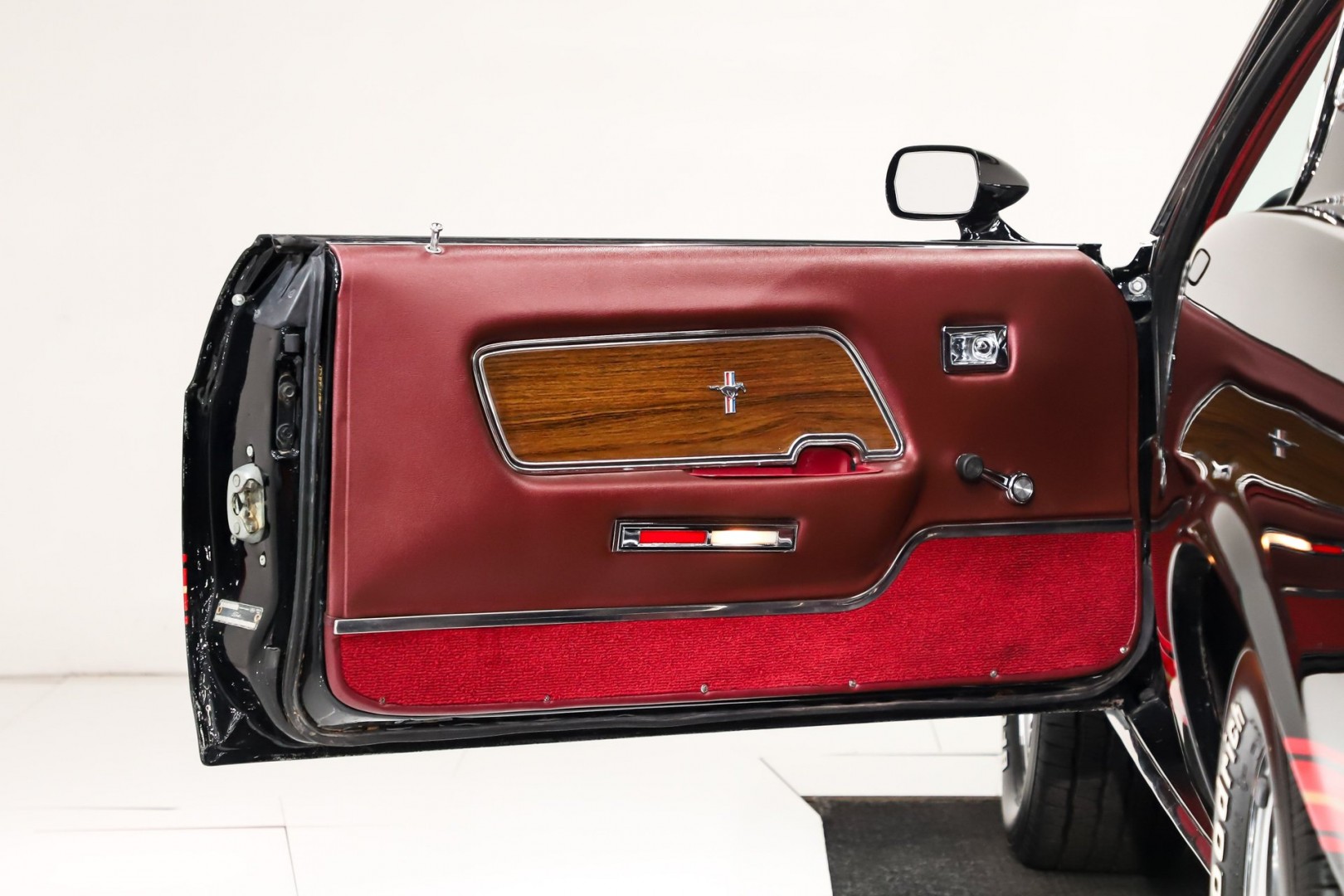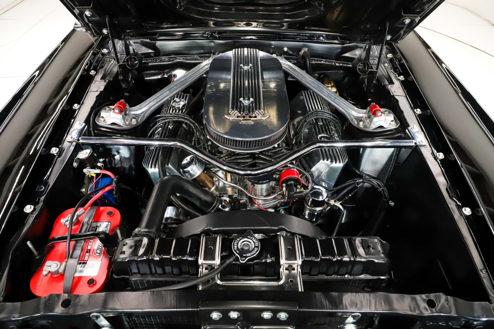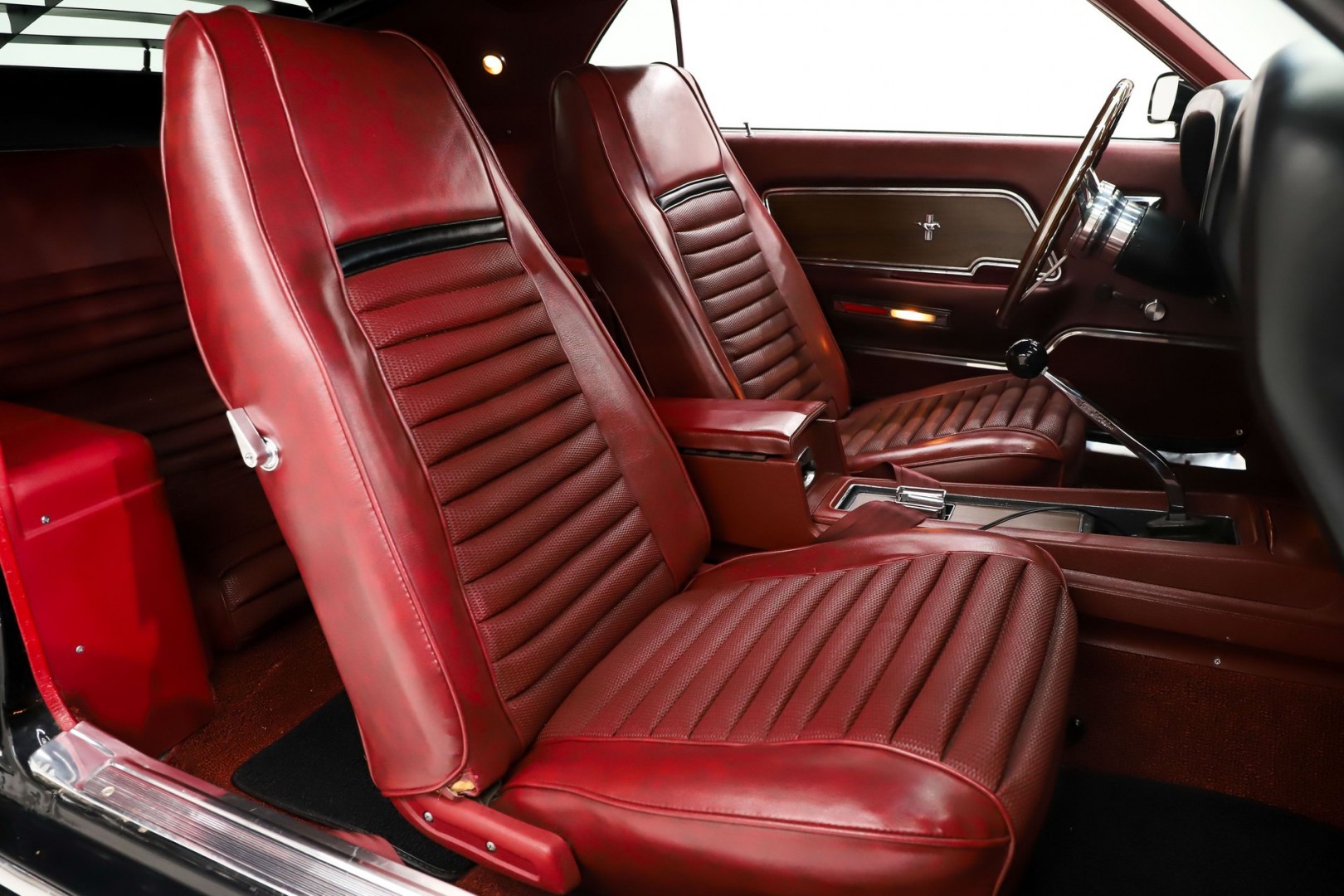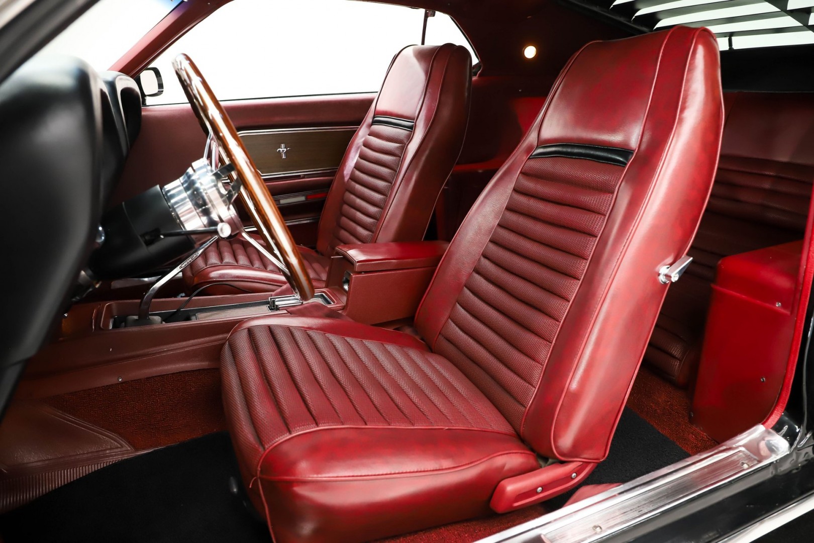 - Интерьер: Заводской «Deluxe» вариант в красном цвете — высокие ковшеобразные сиденья, формованные дверные панели, свежий ковролин и потолочная обивка. Установлены руль в стиле Shelby, колонный тахометр Sun и ретро-аудиосистема. Центральная консоль с Hurst-рычагом — приглашение к драйву.