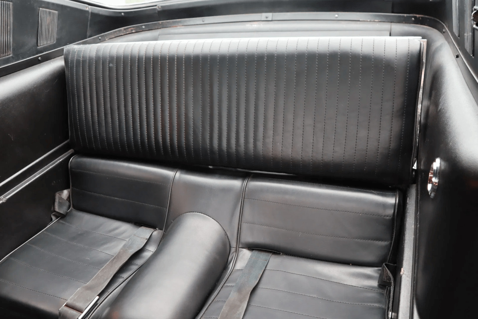 Интерьер и комфорт. Внутри установлен знаменитый чёрный салон Pony в конфигурации 2+2. Сиденья обиты качественной искусственной кожей (skai). Перед водителем располагается характерное рулевое колесо из дерева и алюминия, а также панель приборов Rally Pack с тахометром и часами. В автомобиле сохранена оригинальная радиостанция Ford и заправлен кондиционер. Для безопасности установлены ремни на передних и задних сиденьях.