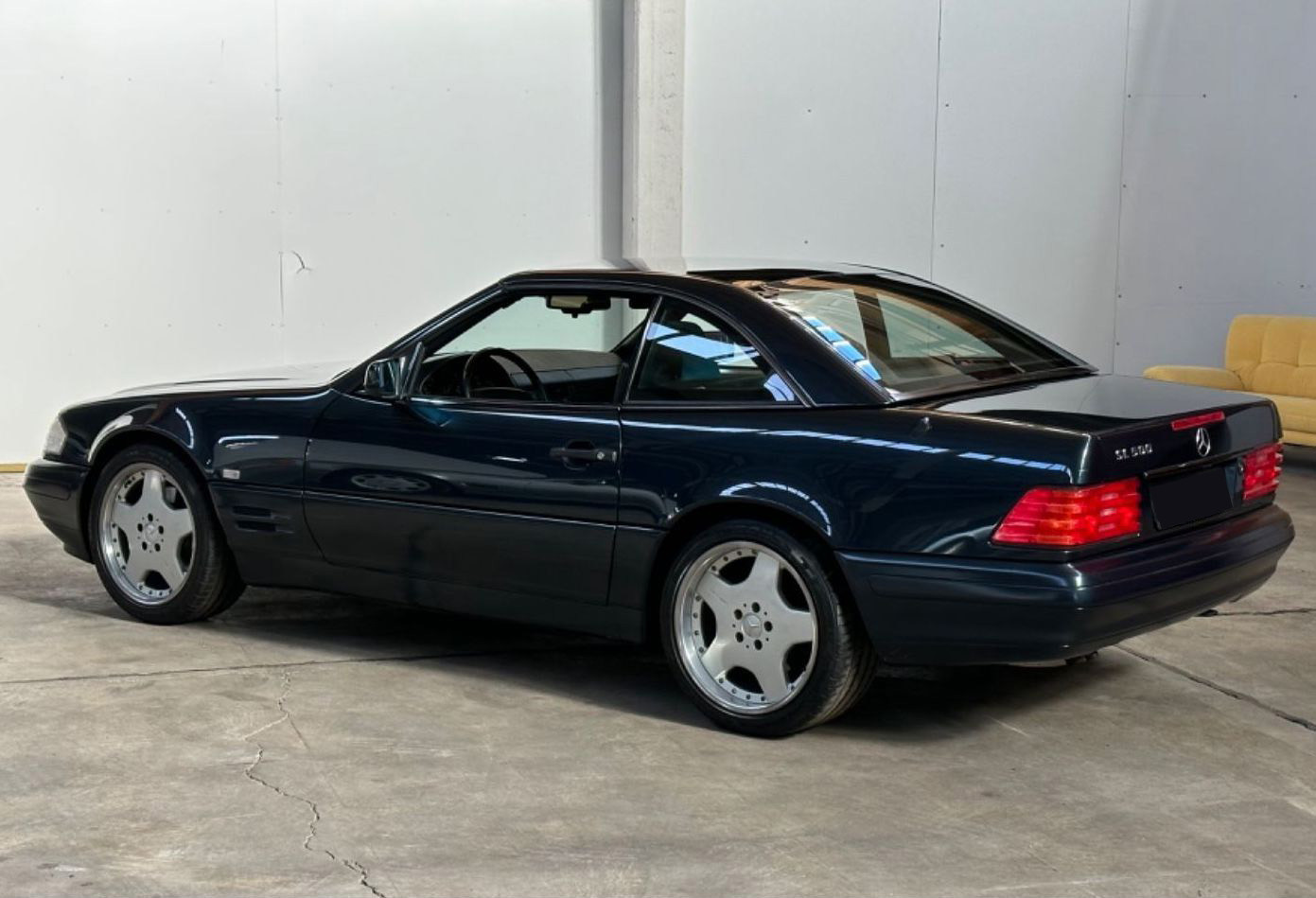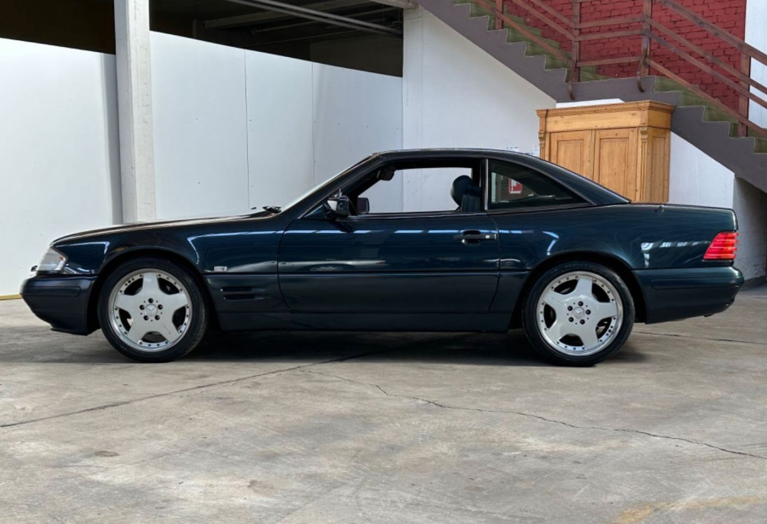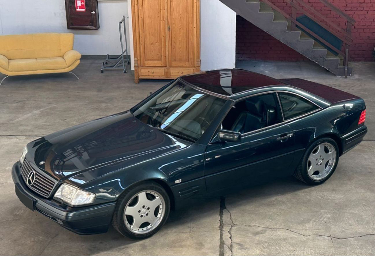 Экстерьер и особенности кузова: Кузов окрашен в благородный цвет «Изумрудно-чёрный металлик» (Smaragdschwarz) и на 90% сохранился в заводской краске. Автомобиль укомплектован редчайшей заводской панорамной стеклянной крышей. Также в комплекте идёт оригинальный мягкий верх тёмно-синего цвета в отличном состоянии (гидравлические цилиндры и блок управления уже обновлены). Облик завершают подлинные двухсоставные 18-дюймовые диски AMG (аналогичные версии SL 60 AMG), которые прошли полную профессиональную реставрацию.
