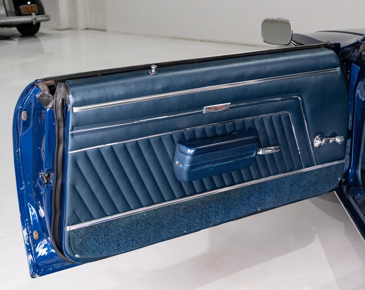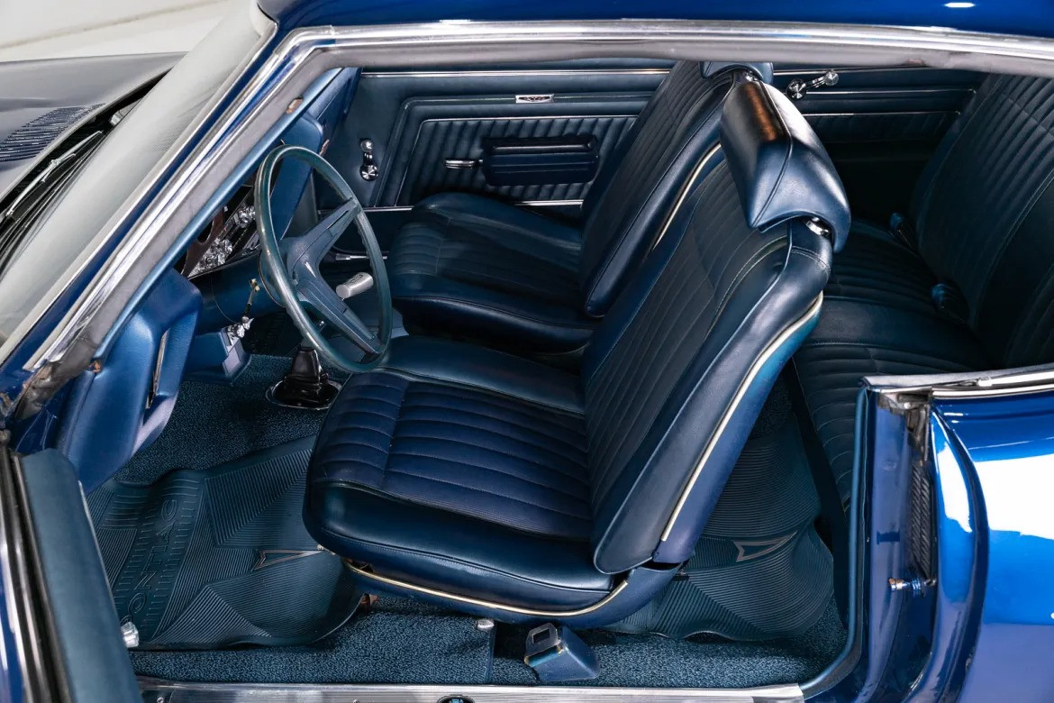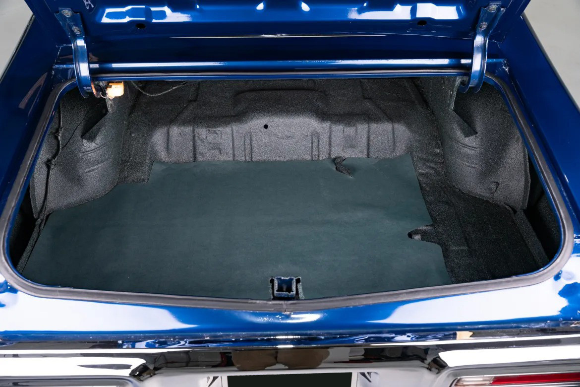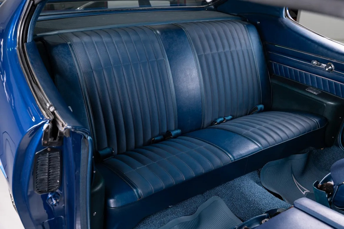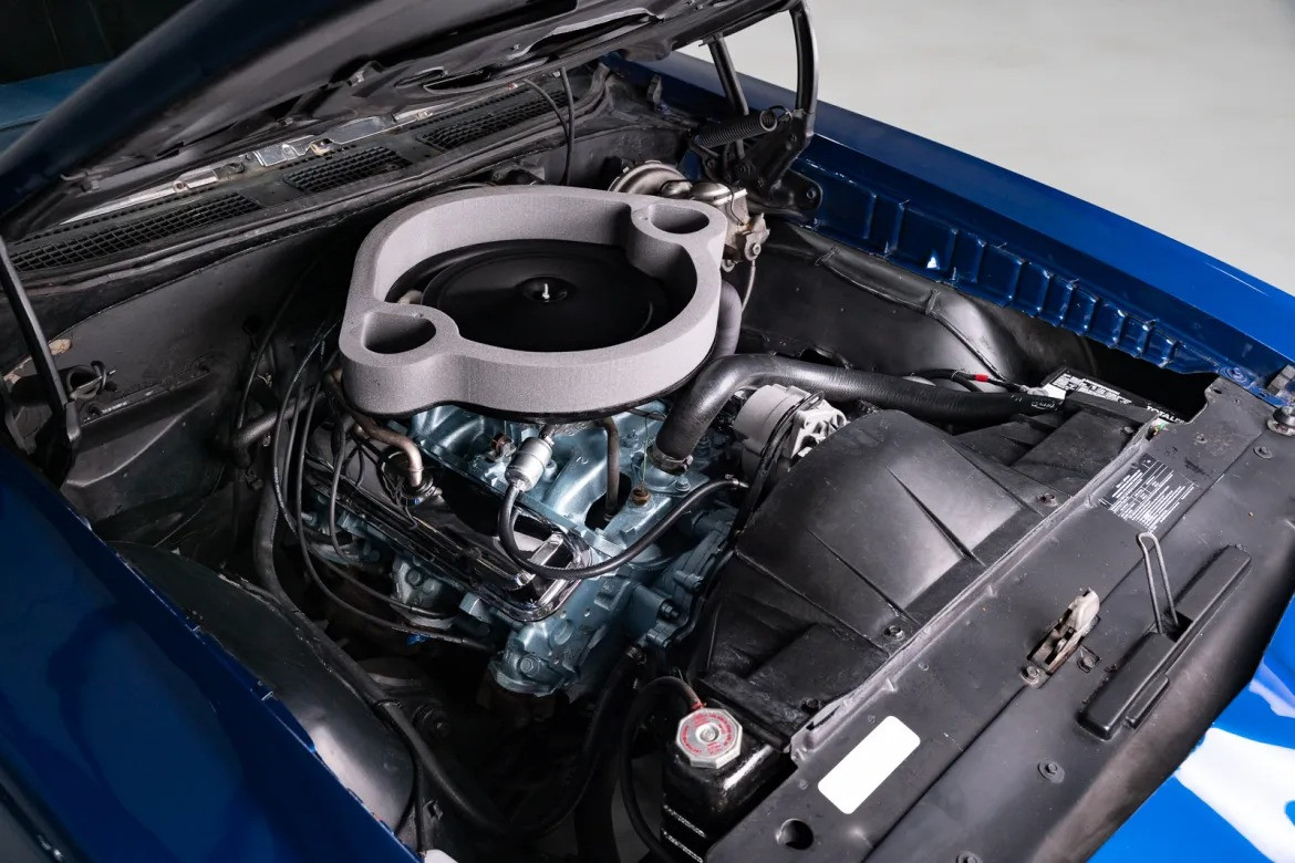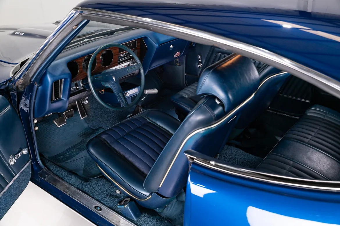 Интерьер: Салон выполнен в синем цвете, идеально сочетающемся с цветом кузова. Внутри установлены классические ковшеобразные сиденья и центральная консоль. Оснащение включает оригинальное AM-радио и восьмидорожечный плеер (8-track). Приборная панель и все элементы управления находятся в превосходном состоянии.