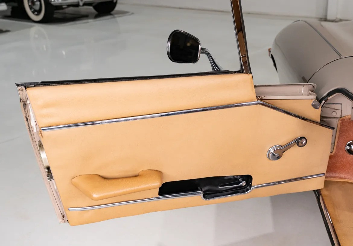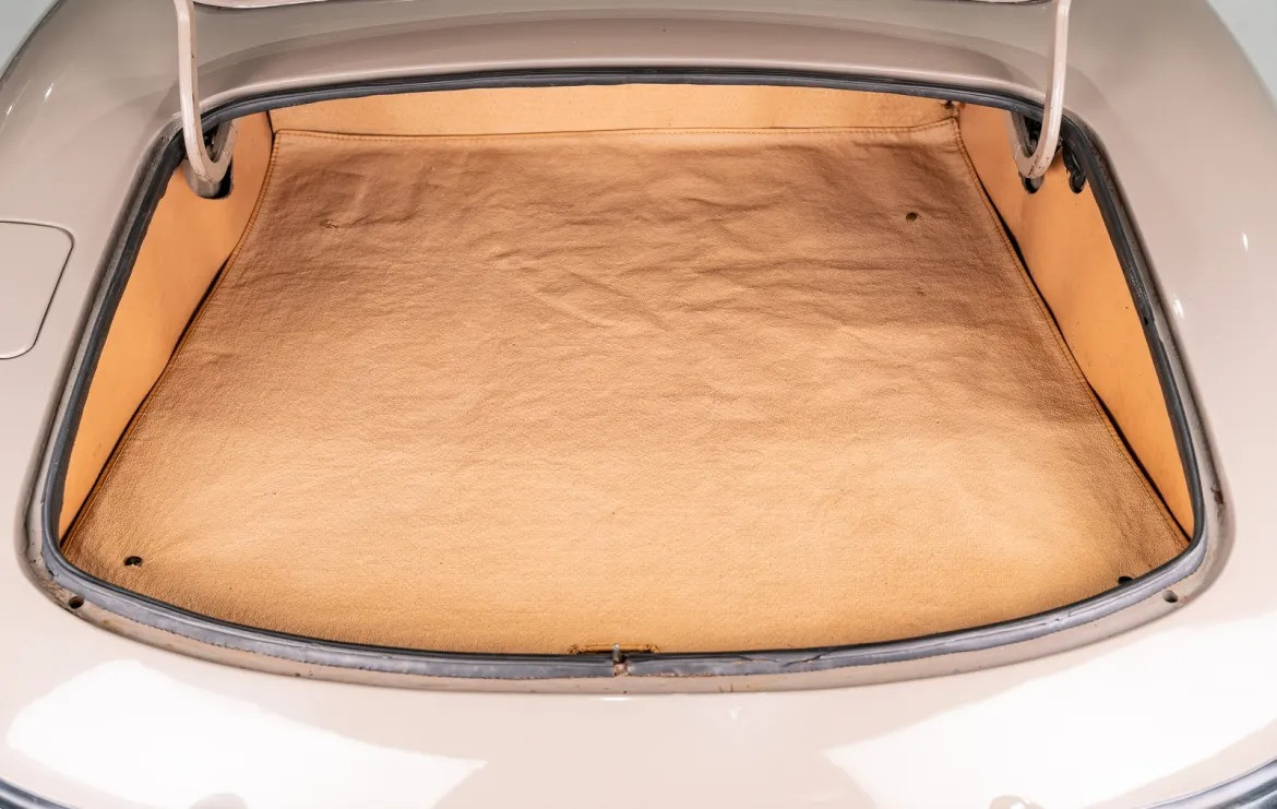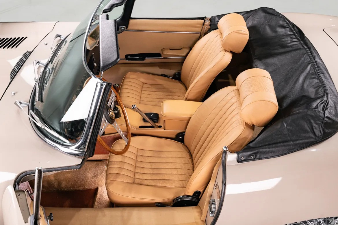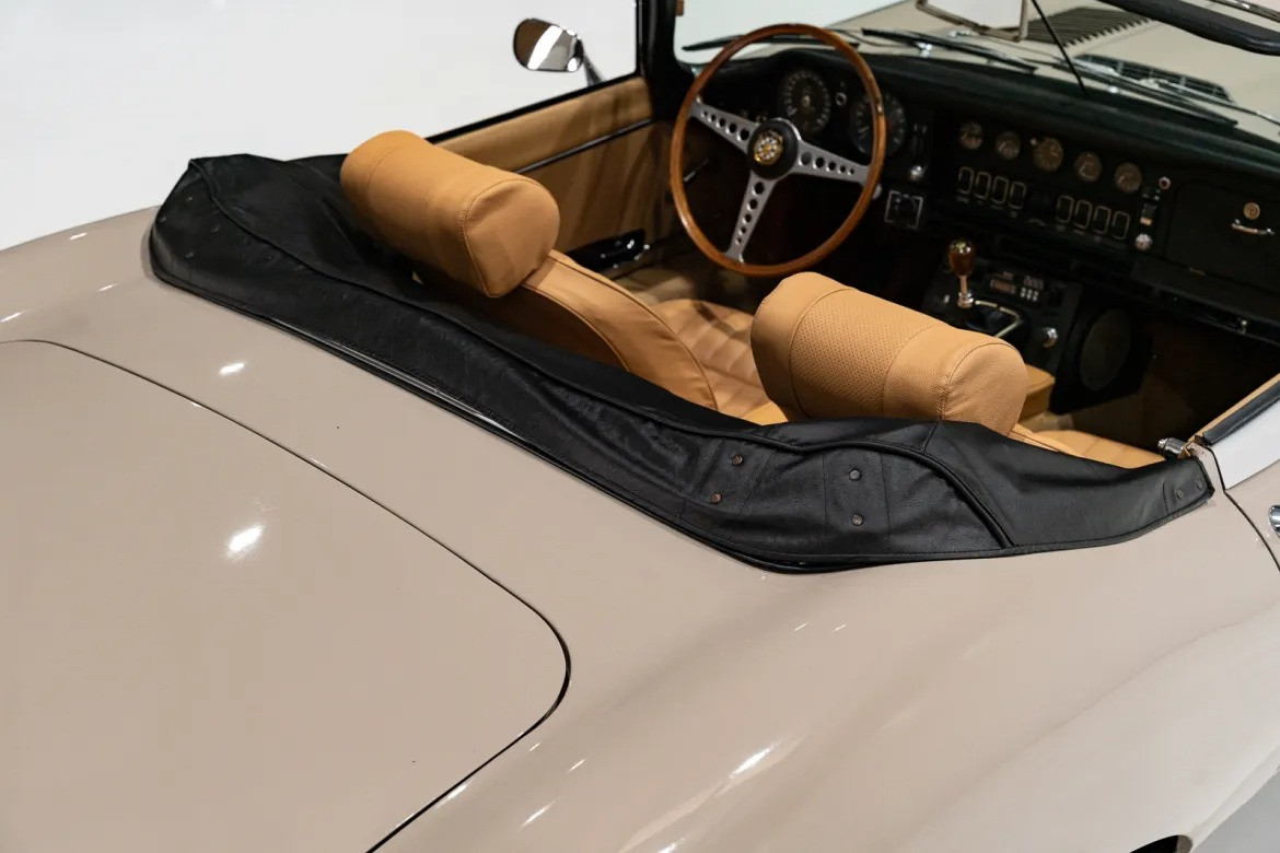 Состояние и аутентичность: Главная особенность этого Ягуара — его невероятная сохранность. Почти всё лакокрасочное покрытие является заводским. Кузов окрашен в изысканный матовый оттенок Ascot Fawn, который идеально сочетается с бежевым кожаным интерьером и чёрным складным верхом. Недавно автомобиль прошёл комплексное техническое обслуживание, подтверждающее его безупречное состояние. Все номера агрегатов совпадают с заводскими.